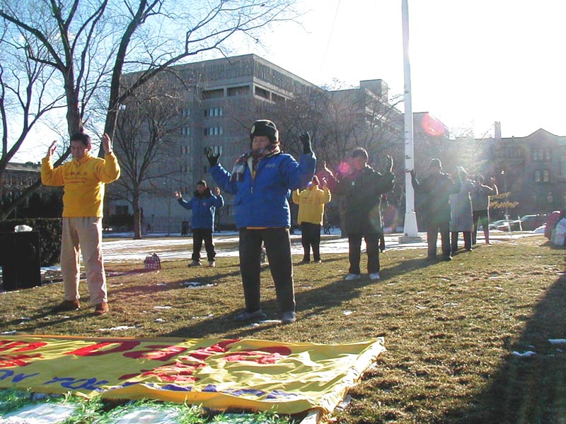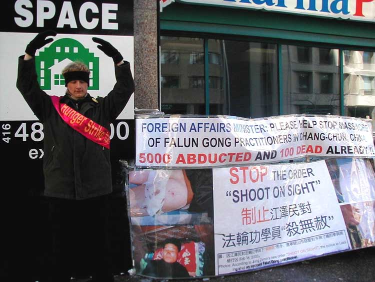 【明慧网2002年3月28日】多伦多西人大法弟子,在加拿大外交部长多伦多办公大楼外举行的为期一周的接力绝食请愿,今天进入第二天。昨日的一场大风雪将多伦多部分地区银妆素裹。今天在微风和融化了的积雪的湿湿的路边草地上,西人大法弟子杰森和数名中国大法弟共同炼功、发正念铲除邪恶。