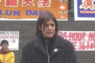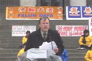 吉姆.新克莱先生首先代表BC省劳工联盟四十三万成员感谢所有绝食的大法修炼者在此时此地为其所坚持的原则而作的一切。并且他受了加拿大全国劳工议会主席肯耐斯.乔治提先生(Kenneth Georgetti)之托,代表二百三十万成员要求加拿大政府对中国江泽民政府镇压法轮大法及其修炼者的残酷暴行提出严正抗议。