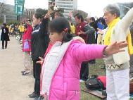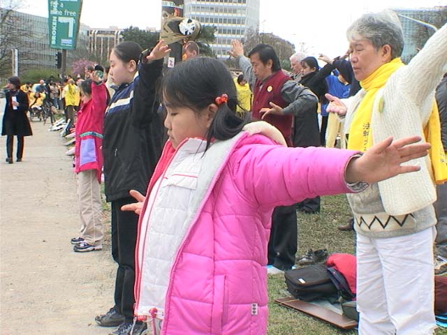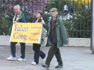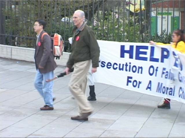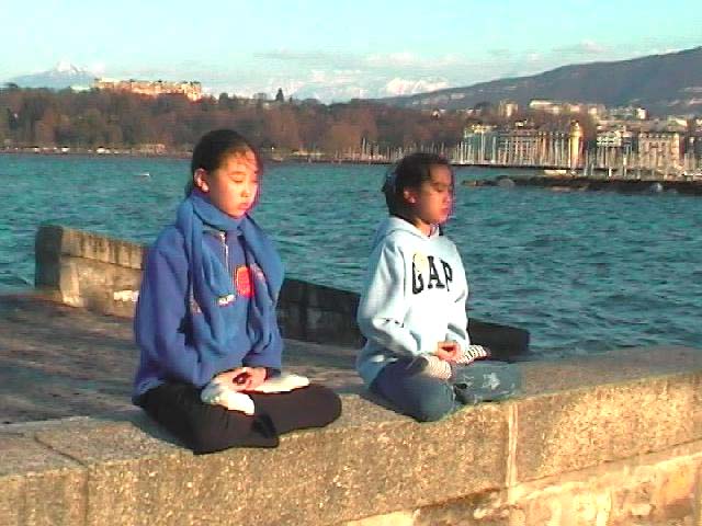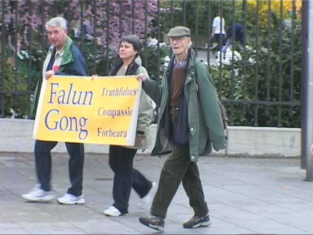 在这组照片中有参加这次活动包括绝食的最大的英国弟子:90岁的弗朗西斯伯爵,一位前英国外交官;74岁的泰伦斯,一名退休老人,曾任一中型企业公司经理;三名小弟子也是不甘落后,包括12岁的爱丽丝,11岁的克瑞思迪纳和8岁的伊莱喆。在日内瓦这座美丽的城市,永久的留下了他们证实大法的足迹和身影。