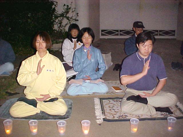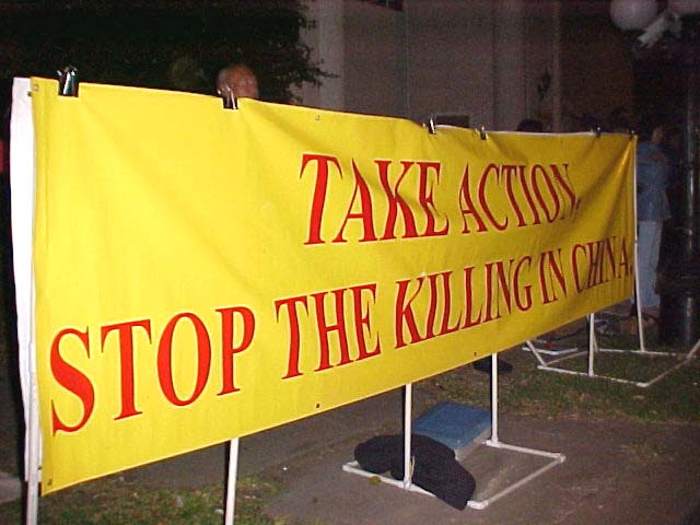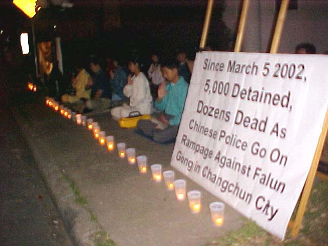 休士顿大法弟子于3月27日七点至九点多在中领馆前举行烛光守夜,横幅上的字“制止虐杀法轮功学员”在烛光中格外醒目,驾驶员慢慢驾车,鸣喇叭表示同情,弟子多次发正念,纯正,慈悲,清除邪恶。