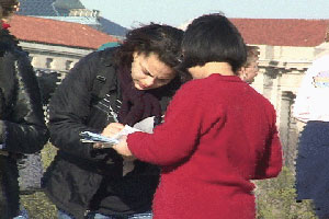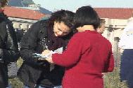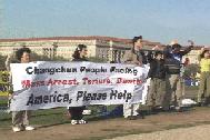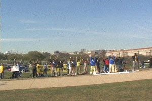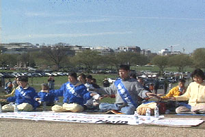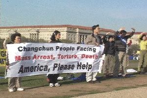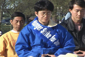 DC六十多岁的李阿姨说:“昨天,在寒风中,我真体会到了什么叫饥寒交迫。可是你知道,长春的功友们在流血,我们吃这点苦又算得了什么。我在这里并不觉得孤单,而是觉得全球的功友心连心。原来在国内认识的功友,在劳教所被那些恶警大冬天,只让他穿着背心、短裤,被浇凉水。人最痛苦的是失去自由,他们连自由都失去了。我在这里绝食虽然苦一些,可毕竟还有精神上的自由。来这里绝食,我已经是迟到的了。2000年12月,女儿女婿上天安门之前给我打电话,告诉我,随后去了天安门之后,他们被捕了。他们被送到门头沟看守所后绝食了8、9天表示抗议。当时,我就想,我要在国内,我也会跟他们一同证实大法,一同去天安门为大法请愿,一同为抗议非人的迫害而绝食的。”