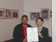 | 唐娜.托马斯女士代表新州众议员辛西瑞丽颁发对法轮功的褒奖令 | “法轮功之友”执行主任阿兰.艾德勒先生致辞 |
