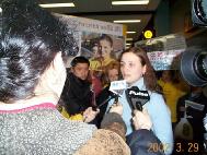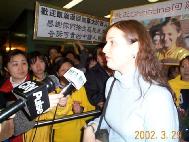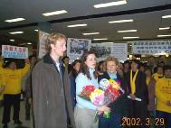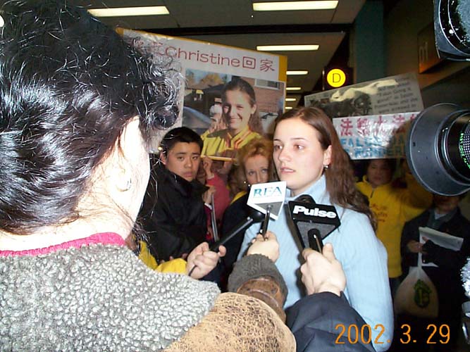刚下飞机的克里思婷和母亲、哥哥拥抱在一起,同时忍不住热泪盈眶,她回答了记者的提问,讲述了自己和男友(另一法轮功学员)在北京的遭遇,她说道:“那里大法学员的处境非常危急,我愿意为了帮助他们做我能做的任何事。”边说边流下了泪水。