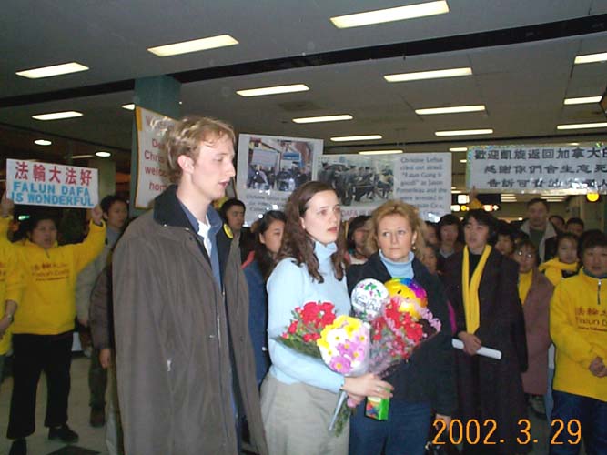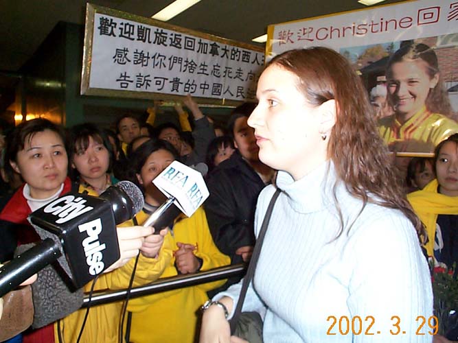 【明慧网2002年3月31日】3月28日,网上的一条消息表明,多伦多学员克里思婷·劳夫特斯(Christine Loftus),在北京海淀区中关村海龙市场附近遭到逮捕,下落不明。消息曝光后不久,克里思婷被释放,于29日晚返回多伦多,于当地时间晚11:00时回到多伦多,几十名当地学员到机场迎接,当地几大中西媒体都到场采访。