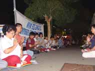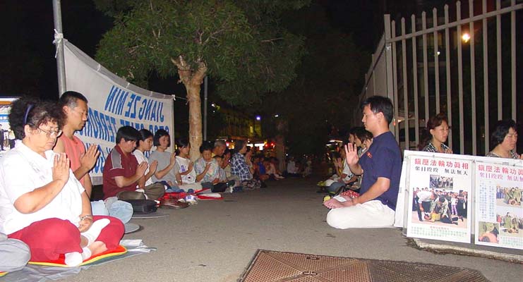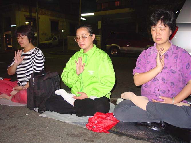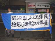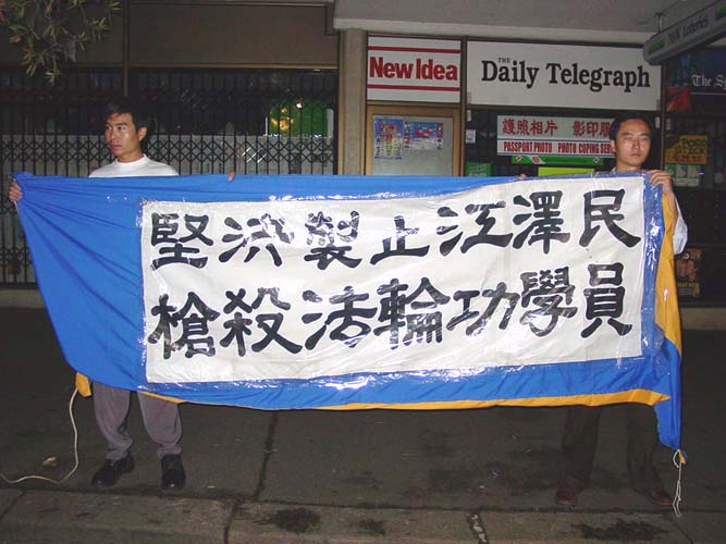 悉尼大法弟子为紧急声援长春大法弟子及国内大法弟子,抗议江泽民独裁枉法的屠杀令,于3月7日(星期四)晚6时至9时,在中领馆前抗议静坐,整点发正念除恶。天下着大雨,但雨中大法弟子纯正、祥和的场,感动着众神、感动着世人、有力地窒息了邪恶!