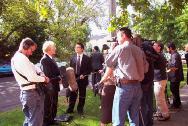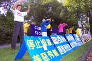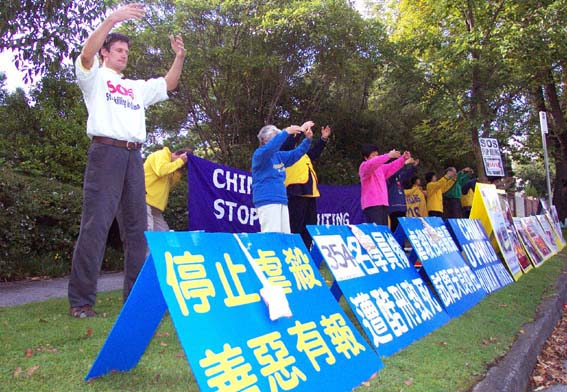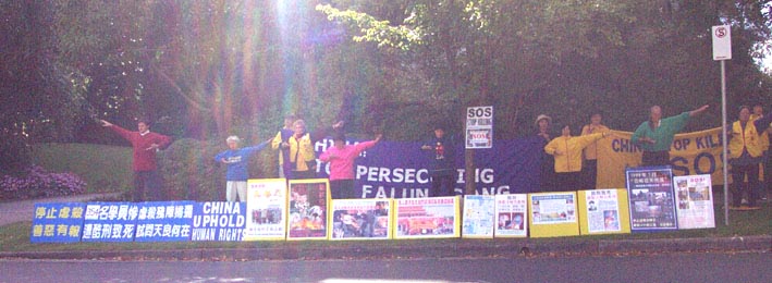 近20名学员在领馆对面的草地上打坐、发正念,6-7名学员负责接待媒体,先后有6名学员接受了电台、电视台记者的采访,有些是现场直播报道。学员述说了同修们被捕过程中遭受了殴打,家人无法与他们联系等,介绍了中国法轮大法学员在江泽民政治流氓集团两年多的残酷迫害中所遭受的难以想象的折磨以及新近由人间首恶发出的“杀无赦”非法命令,呼吁所有善良人共同制止这场邪恶的镇压。