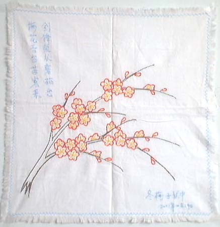 【明慧网2002年4月1日】注:以下两首诗是写在一块半尺多长的白布条上的。不知费尽多少周折才辗转从狱中带出来的。同时带出来的还有同修在狱中自己用针线在白布上刺绣的一幅梅花图,以及“剑锋须从磨砺出,梅花香自苦寒来”的自勉诗句。落款是“冬梅于狱中 2001年10月19日”。