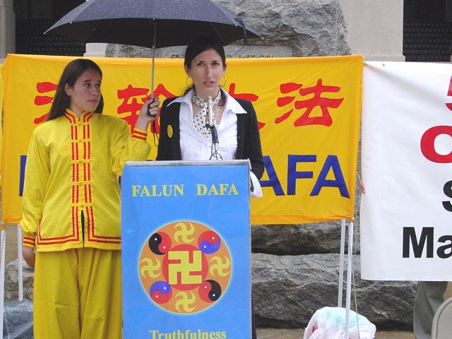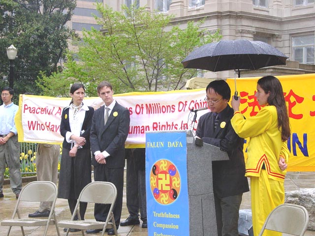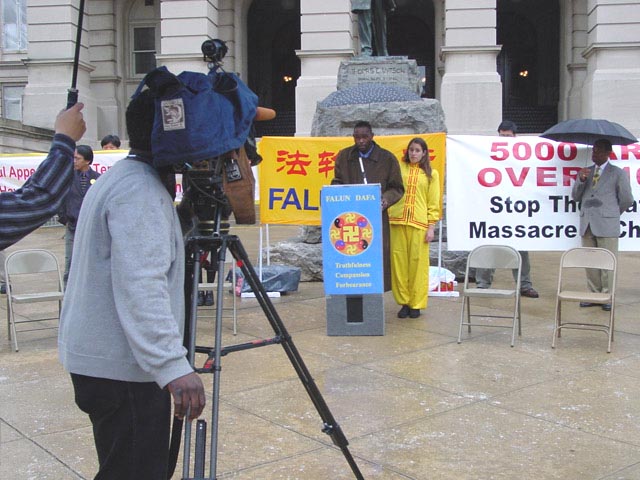 12点,法轮功学员罗伯特.凯乐威(Robert callerway)代表学员发言,抗议江氏下令“杀无赦 ”带来长春新一轮对法轮功学员的残酷迫害,并感谢州政府特许法轮功学员在这里举行新闻发布会和州政府的支持。罗伯特宣读了乔治亚两位议员路易斯(John Lewis)先生和麦肯尼(Cynthia Mckinney)女士为此次新闻发布会写来的信。路易斯议员表示他将继续与法轮功学员一道,为结束这场不公正的镇压而努力。罗伯特最后呼吁各界人士为了正义和自由紧急行动起来,制止这场在中国长春进行的大屠杀。