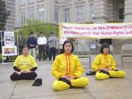上午11点,法轮功学员们从各自的工作岗位赶到州府门前,此时天空下起了一阵暴雨,但这并不能阻挡学员们呼吁江氏集团停止镇压,谴责其残暴行径的正义之举。学员们有的举着“法轮大法”“真,善,忍”,“停止残酷镇压”,“在长春,5000人被抓”等横幅及洪法展板默默伫立在雨中;有的则在舒缓的音乐中展示功法。