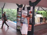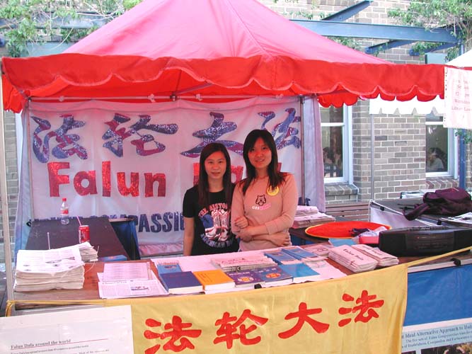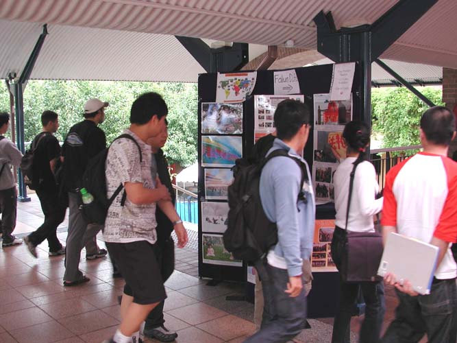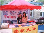 我们把各种优美的炼功展板摆在摊位前,还有一些揭露大陆江泽民对善良大法弟子迫害的图片。隔壁摊位上的一个西人走过来看我们的图片,问了我们一些问题,当他了解了真相后,也要帮我们发资料,有时有的人走过我们的摊位没有接资料,当走到他们的摊位时,他就有强烈建议这些人拿资料,而且嘴上还喊着“法轮功”,“法轮功”。