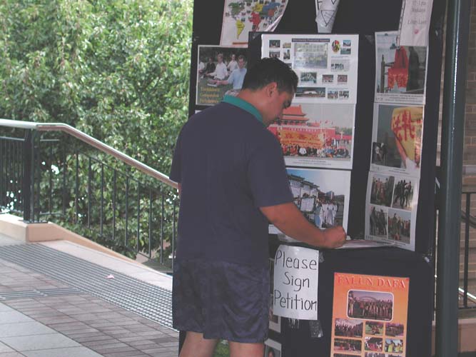 第二周我们的弘法地点从校园主干道转到了图书馆前,虽然我们分到的摊位不是很突出的位置,却也丝毫阻挡不了有缘人。我们将正法之路图片展架并排放在行人必经而又不阻塞交通的地方,引来许多人在图片前驻足,我们写好了“请签名”的标签放在展板前,很多人在看完图片后自动就签了名,已经不需要我们去问。这些善良的人,在帮助制止镇压的同时,也为自己赢得了美好的未来。