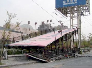 不到一个月时间之内,北京城雨后又遭狂风沙尘侵袭。报道说4月5日的雨后京城继续受扬沙天气困扰,6日北京刮的五六级大风,令民房被吹倒、孕妇被砸伤。4月7日北京东三环亮马河边一块高达十余米的高架式广告牌被风吹倒。广告牌从根部断裂,巨大的冲力撬翻了周边的铺路石。大头向南砸在绿地边沿的人行道上,连带着广告牌上的电线,还压倒了几根电线杆,路边一溜小店全都停了电。