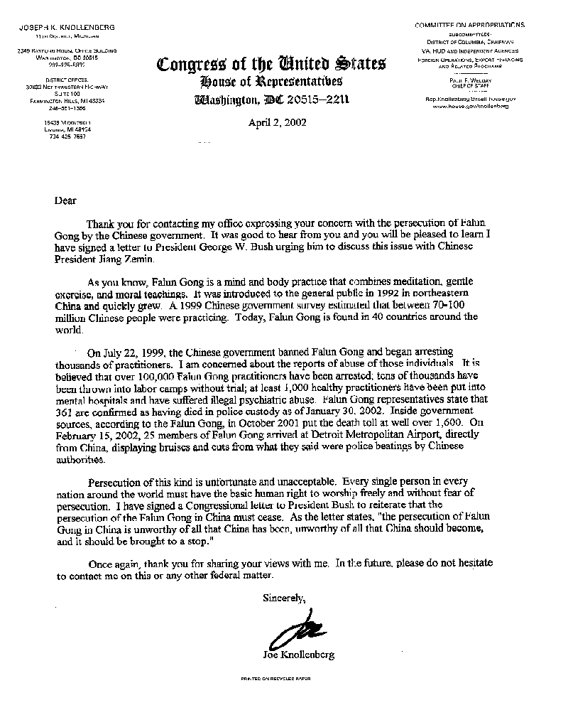 1999年7月22日,中国(江泽民)政府取缔了法轮功,开始了逮捕成千上万的法轮功学员。对于资料记载的法轮功学员所遭受迫害的情况我深表关注。据信,已有超过十万名法轮功学员被逮捕;几万人未经审判押入劳改所,至少有1000名身体健康的学员被送进精神病院,遭受非法的滥用精神药物的摧残。法轮功发言人声明到2002年1月30日为止,已证实有361名学员死于警方拘留所。据法轮功学员说,来自政府内部的消息表明截止至2001年10月,死亡人数远远超过1600名。2002年2月15日,25名从中国直接抵达底特律国际机场的法轮功成员让公众看到了他们身上的伤痕和伤口,据他们本人说都是中国警察殴打的结果。