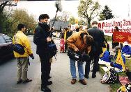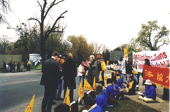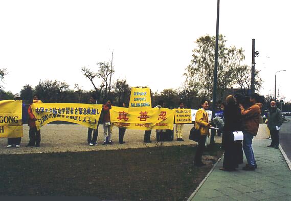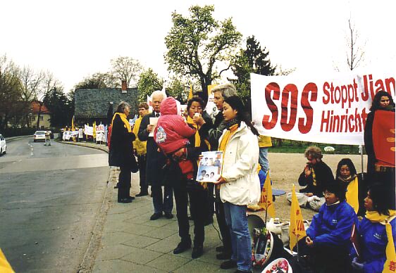 专程从英国赶来的莫恩勋爵在会上发表演讲,谴责江氏集团无理践踏人权;刚刚从中国获释并返回爱尔兰的研究生赵明讲述了他因坚信真善忍而被江氏集团非法关押近两年,在关押期间遭受肉体及精神摧残的亲身经历;从澳洲赶来的戴志珍女士抱着两岁女儿声泪俱下地讲诉了其年轻的丈夫(大法弟子)被江氏集团残酷虐杀的事实。他们呼吁全世界所有善良的人站出来伸张正义。他们的发言有力地揭露了正在德国散布谎言的江泽民的无耻嘴脸,也激起了在场德国警察的义愤,一位负责警官说:“江泽民会从这里经过,我希望他立即完蛋!”