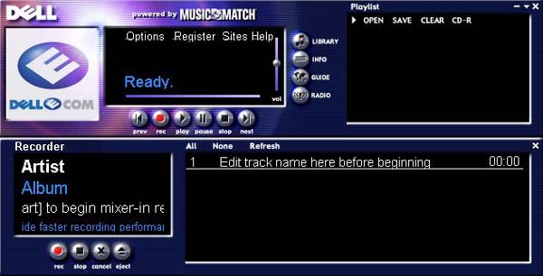 5.将要转录的音乐文件准备好,如用Real Player播放RM/RA/RAM文件,用Windows Media Player 播放MPG录像等。点击MUSICMATCH Jukebox录音面板(Recorder)上的红色“Rec”(录音)键即开始录音。紧接着用Real Player等开始播放所要转录的文件。播放完毕后,按录音面板(Recorder)上的“Stop”(停止)键,录音完成。