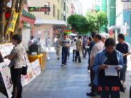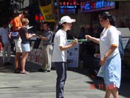 警察们只要看到穿黄衣服的人就拦住,又查身份证,又扣押,当看到越来越多的无辜的穿黄衣服的学员被扣押时,路过的市民们非常不解,他们问这些人做错了什么,警察答不出来,说:这是上面的命令,这里禁止穿黄色衣服的来往。学员说:我们是炼法轮功的,江泽民害怕黄衣服上的字:“真善忍”,“法轮大法好”,所以我们在这儿遭到不公。