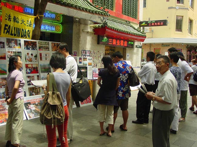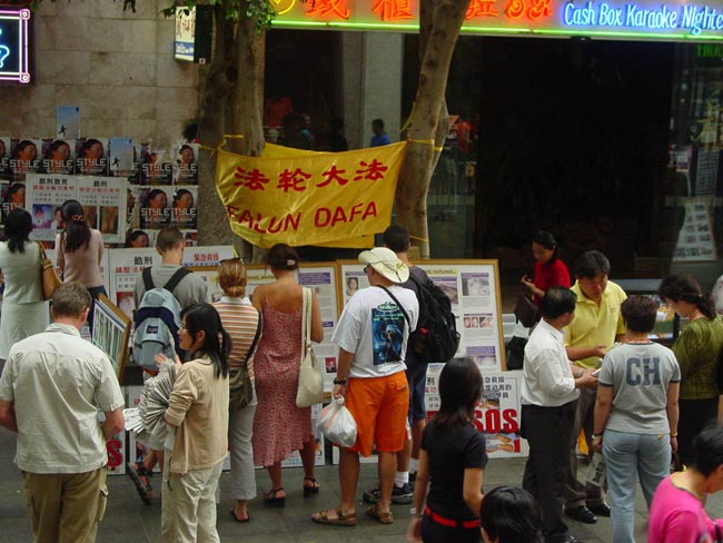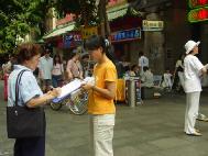 一次,几个学员坐在一辆小车里,在街上开,因车身贴有SOS(紧急救援),FALUN GONG(法轮功)的标签,一路上他们都被许多警车跟踪。他们来到加油站,警车也停在旁边。学员拿上资料,向警察走去,平静地向他们讲真相。警察们静静地听着,露出同情的神色,他们接过资料说:我们知道,只是没办法,我们要执行我们的任务。学员的这辆车还被便衣警察跟踪,学员们也停下车,给他们资料,他们接过,抱歉地笑笑,不久他们把车调头开走了。