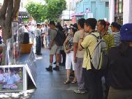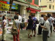 过了一会儿他们就又出现在文化宫前。 这里有西藏运动人士为人权而举行的示威活动。 还有约50个法轮功人士在经过正式官方批准的不在江参观路线内的地方集会,他们在文化宫前集体练功。在现场的记者招待会上,来自(中国)国外的法轮功人士介绍了他们(在中国)受到各种残酷迫害的经历。讲述了他们长达数月,数年被监禁在中国的监牢和劳改场,给人留下了深刻的印象。