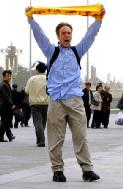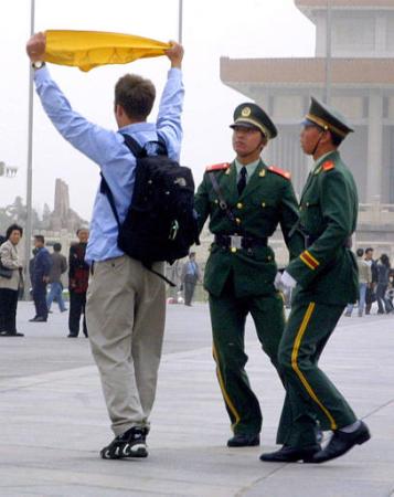 【明慧网2002年4月15日】美联社4月14日北京消息,一名身份是美国大学生的年轻男子,星期日在拥挤的天安门广场上打开一面横幅高喊支持法轮功的口号后被[警察]平静地带走。