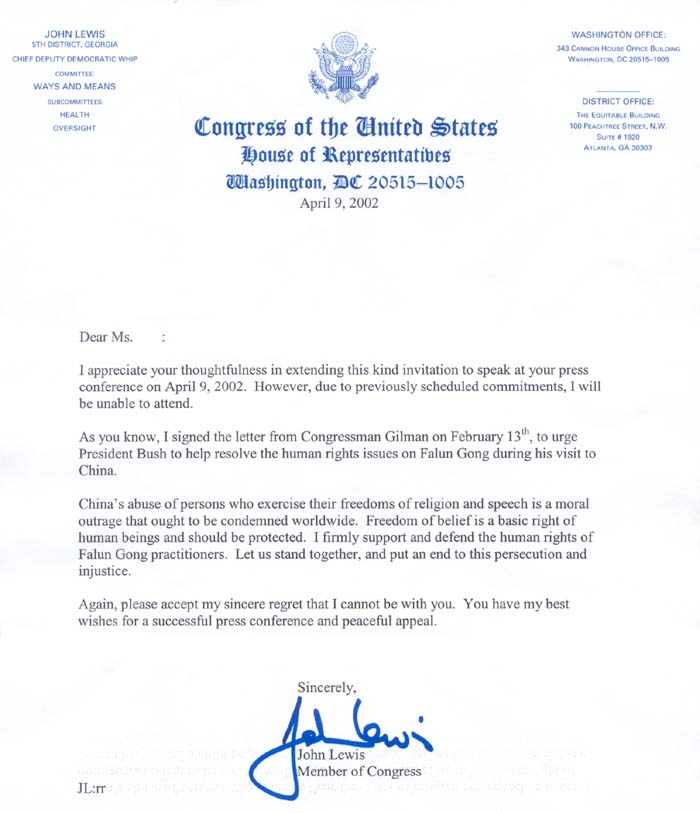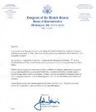 如你所知,2月13日我在众议员吉尔曼写的信上签了名,以敦促布什总统在他访问中国时帮助解决有关法轮功学员的人权问题。