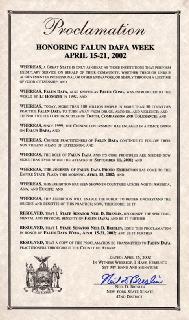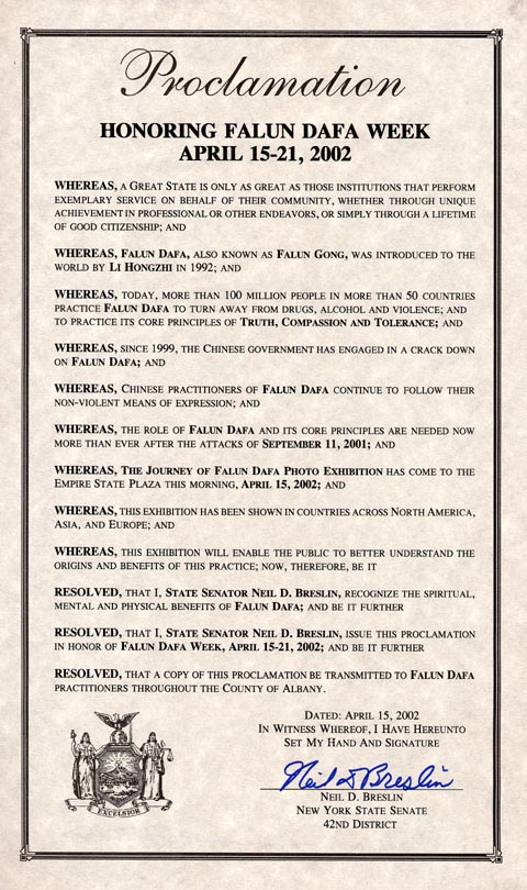 并决定,我,州议会议员内尔 D.布瑞思林签发本状,对2002年4月15日至21日的法轮大法周表示祝贺;
