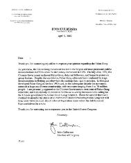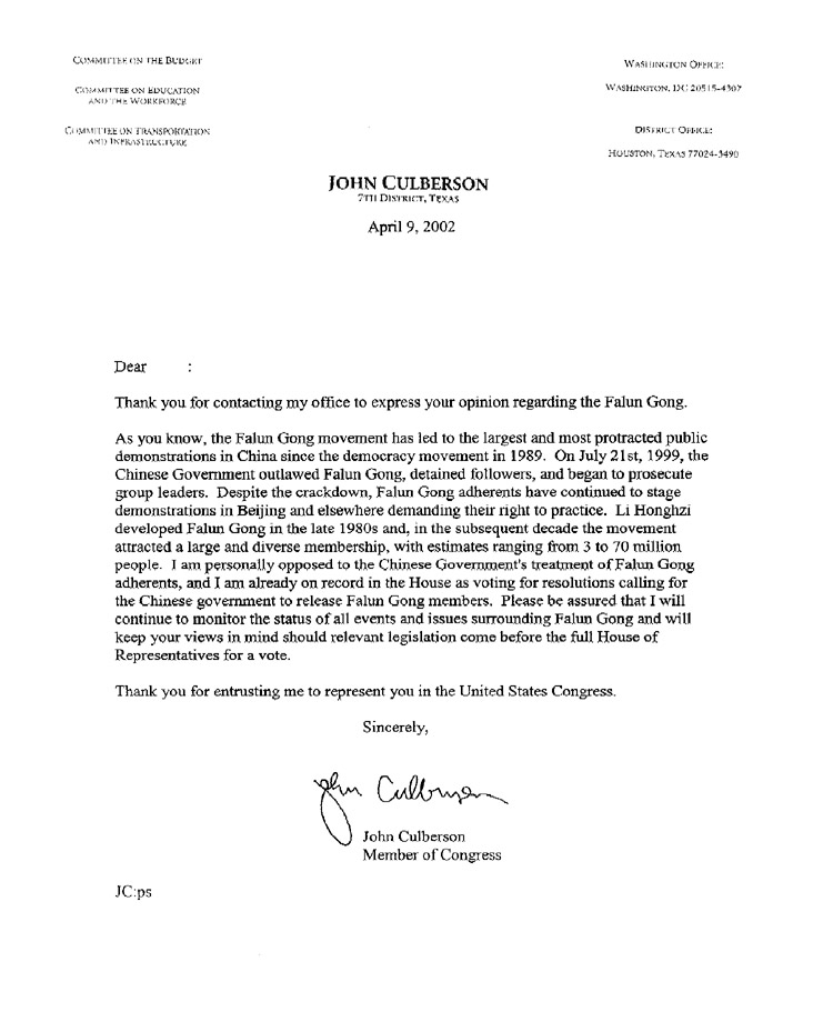 您知道,法轮功运动在中国已成为自1989年民主运动以来最大规模和最持久的公众抗议运动。1999年7月21日,中国(江泽民)政府禁止了法轮功,拘禁法轮功修炼者,并开始起诉法轮功负责人。尽管横遭镇压,法轮功修炼者们仍继续在北京及各地发起(和平)抗议活动,要求修炼的权利。李洪志先生于八十年代末(注:应为九十年代初)推出了法轮功,十年来,该功法吸引了众多来自不同背景的修炼者,据估计其人数达三百万至七千万之多。我本人反对中国(江泽民)政府对法轮功修炼者的不公正对待,我也已在众议院公开投票赞成通过呼吁中国(江泽民)政府释放法轮功修炼者的决议案。敬请放心,我将会一如既往地关注所有有关法轮功的事宜及状况,在众议院有任何相关议案付诸表决时我定会考虑您的意见。