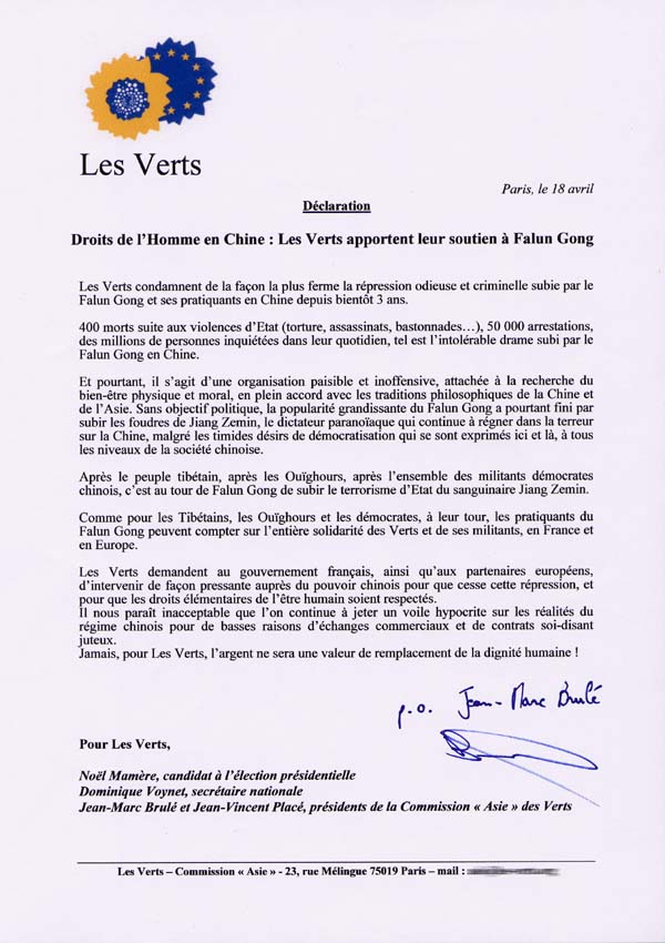 象西藏人,维吾尔人,民主人士一样,法轮功修炼者同样可以完全信赖绿党及其活跃成员的支持,无论是在法国还是在欧洲。