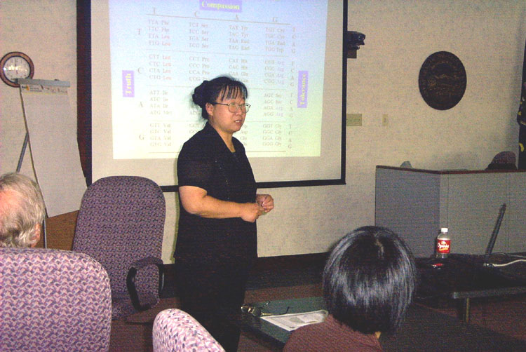 【明慧网2002年4月23日】4月17日上午,应堪萨斯综合农业及医药研究机构(Comprehensive Agricultural and Medicine Institute)的邀请,在美国休斯顿贝勒医学院任职的法轮大法学员封莉莉教授来到堪萨斯州堪萨斯首府托匹卡,向来自堪萨斯州各地的州议员、议员代表和医学专家做了一次学术演讲。她的报告的题目是:由法轮大法学员的嗜中性白细胞中的基因表达方式,看法轮大法修炼的生物学、社会学及哲学的意义。封教授首先谈到98年的中国协和医科大学、中国协和医科大学附属医院、北京医科大学等8所著名医学院及医院联合进行的对北京上万名法轮大法修炼者的健康调查结果。这项调查结果表明:法轮大法对疾病的总治愈率是99.1%,痊愈率58.5%,对身体疾病的显著疗效率是80.3%,对精神疾病的显著疗效率是96.5%。接着,封教授谈到她对法轮大法学员的血液嗜中性白细胞的分析检测结果,并且进一步分析其中的生物学及免疫学机制。