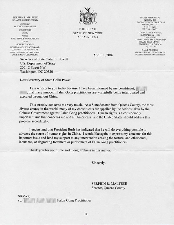 随信附上一封我写给国务卿科林·鲍威尔的信,我在信中强烈要求美国政府出面干预以保护中国人权。我希望我的信件能帮助制止这场无理智的针对法轮功学员的残酷暴行。