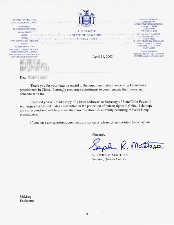 这种残暴行为使我非常担忧。作为代表皇后郡的州参议员,在这个世界上最具多样性的社区中,我的许多选民对中国(江泽民)政府为镇压法轮功学员而采取的行动感到惊恐。人权问题是我与所有美国人关注的极为重要的问题,美国应该对此做出反应。