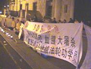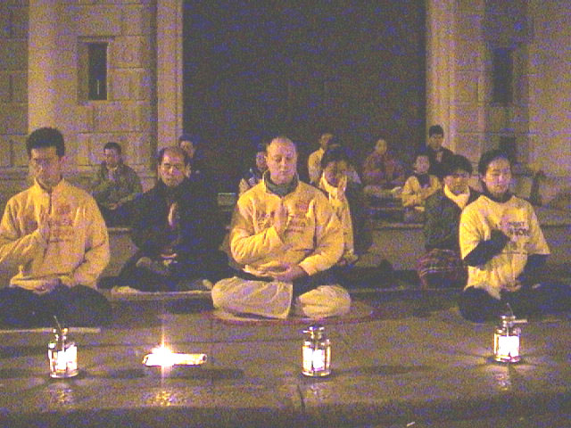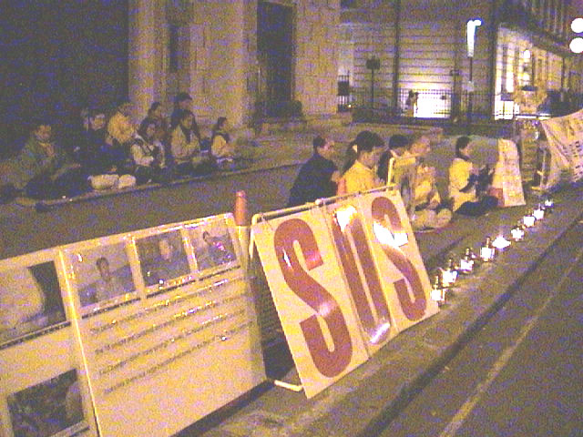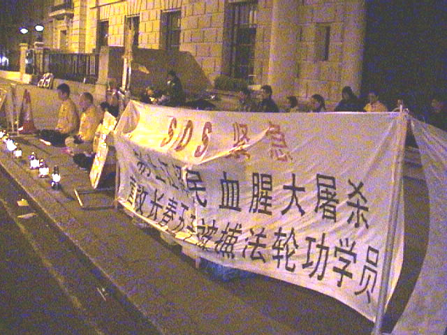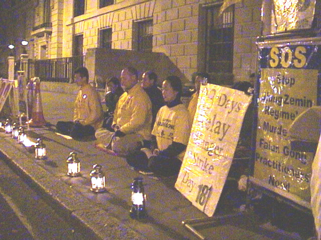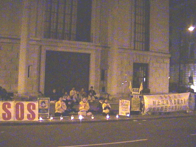 深夜的伦敦,依旧是“不夜城”,人流车流不断。我们伦敦及周边城市的很多大法弟子都赶到使馆门前集体发正念。餐馆业的弟子从外地赶来时已是深夜三点多。几盏烛光在夜里的凉风中闪烁着,映照着弟子们坚毅的目光。大家整夜准时发正念,不觉天亮了,当黎明的曙光照在我们绝食弟子彻夜未眠的脸上,看见的依然是一张张充满活力与信心的脸。我们知道,我们正以我们的行动兑现着我们当初对师父,对众生以及我们自己许下的誓言。