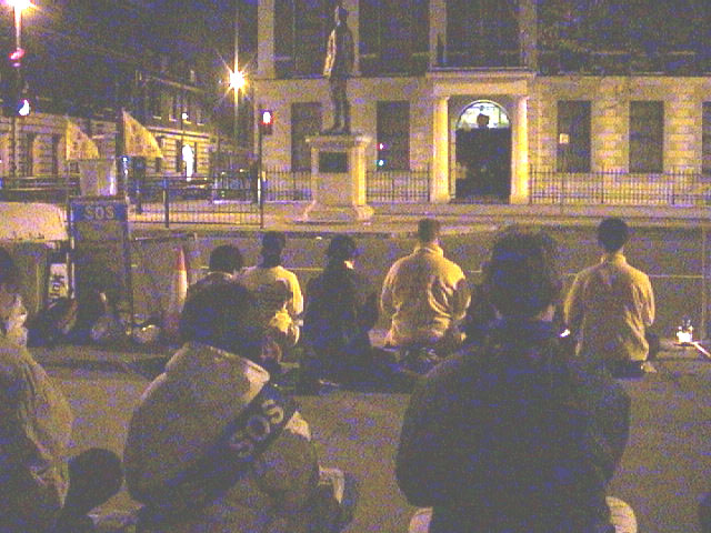 最让人感动的是在我们发正念时,一位衣冠楚楚的西方高个白人走到我们面前,他双手合十,跪在地上给我们磕头礼拜,然后默默走开。我们不知道他看到了什么或感受到了什么,他的崇敬代表了广大英国人民的支持。在我们24小时的发正念中,过往的行人和司机,不时用不同方式表达着他们的支持。不少人感慨地说:“法轮功太神奇了,我们敬佩你们的献身精神和坚忍不拔的毅力,你们一定会成功的!”