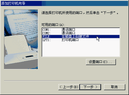 3、在“可用的端口”中选择“FILE:在磁盘上创建文件”: