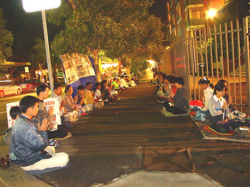 【明慧网2002年4月24日】4月20日、21日、22日,悉尼百余名大法弟子在中领馆前举行连续3天持续发正念活动。每天晚6点发完正念后,大法弟子按每个正点仍继续各自在家里坚持发正念。部分大法弟子在最后一天晚10点发完正念后,仍留下来通宵持续发正念。开始两天的烈日当头,丝毫也没能影响大家坚定发正念的决心。22日又变为阴雨天,乌云密布,不时飘着小雨,大法弟子集体发正念,雨停了。至中午,大法弟子分散去吃午餐时,瓢泼大雨又倒了下来。整整一天便一直处于虽乌云密布,但雨却欲下不能的天气状况,至夜间,天气甚至变成皓月当空,秋高气爽了。