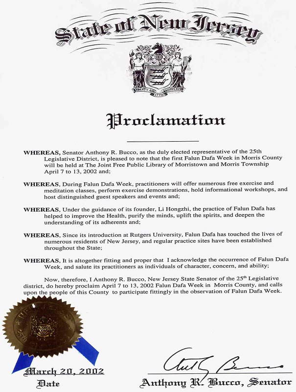 为此,我,安东尼·巴卡,新泽西州第25选区的参议员,特此宣布2002年4月7日至13日为摩利斯县“法轮大法周”,并号召本县人民相应参加“法轮大法周”的庆祝活动。