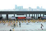 今天是一个特别的日子,所以来参加活动的学员也比平时多,有接近二百多人。学员们在排列整齐后,以发正念开始了今天的活动。一些学员站在后面拉横幅,其中一条横幅写着“正念除恶制止迫害 开创和平公正环境”,正好是香港学员处境的写照。法轮功在香港之所以仍然拥有合法地位,是因为“一国两制”的实行,但一国两制在香港落实的情况,每况愈下,尤其是香港当权者向江泽民专制集团低头,对“异见”人士或团体的处理,变得愈来愈不公正、不合理。要在香港这个特殊的环境下,开创和平公正环境,需要学员们继续正念除恶,讲清真相,同时学员们自己也应该不断学法向内找,不让邪恶有钻空子的机会。
