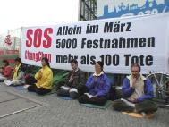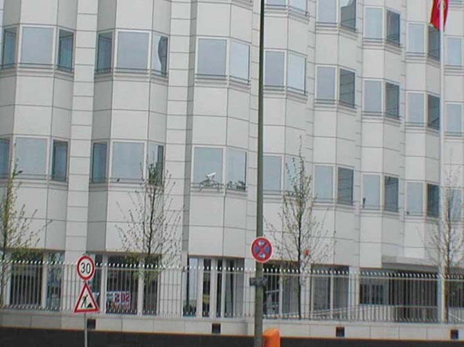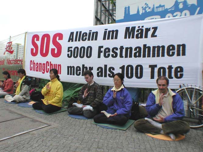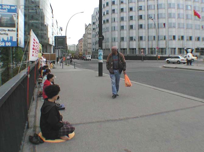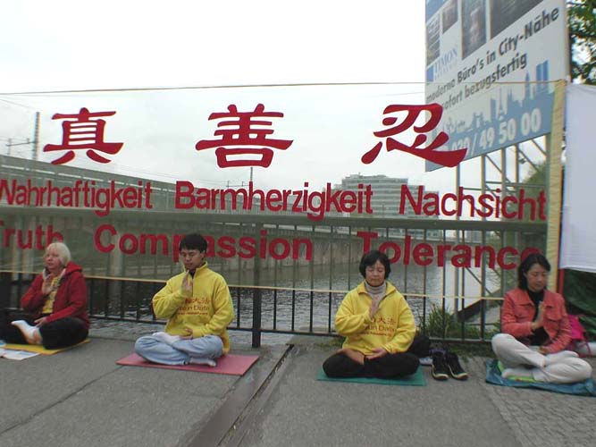 除柏林本地学员外,邻近地区如德累斯顿、哥廷根等地的学员们也不辞辛劳,纷纷赶来参加活动,他们中有的还带着幼儿、幼女,有的全家一起来了。大家的共同心愿是:要在这里发出最纯、最正的正念,彻底铲除邪恶,不能让它继续迫害大法弟子、毒害世人和众生。每到整点大家齐发正念。中午时分,开始下起了小雨,发完正念后就再也没下过雨。活动快结束时,太阳透过阴云,露出了脸。这时,一位学员发现使馆大楼的大玻璃上明显地映出了SOS的字样。