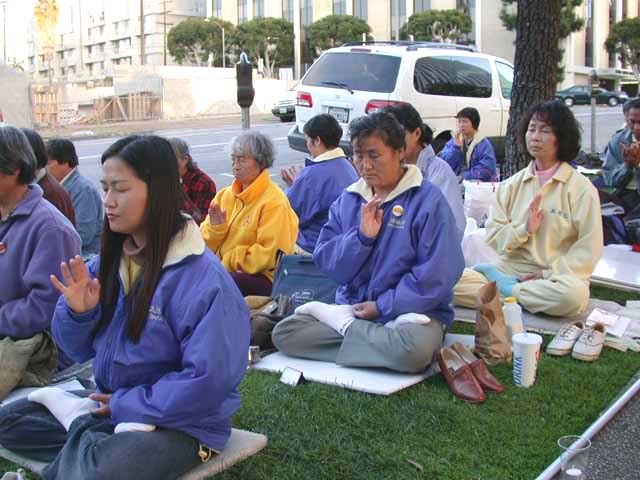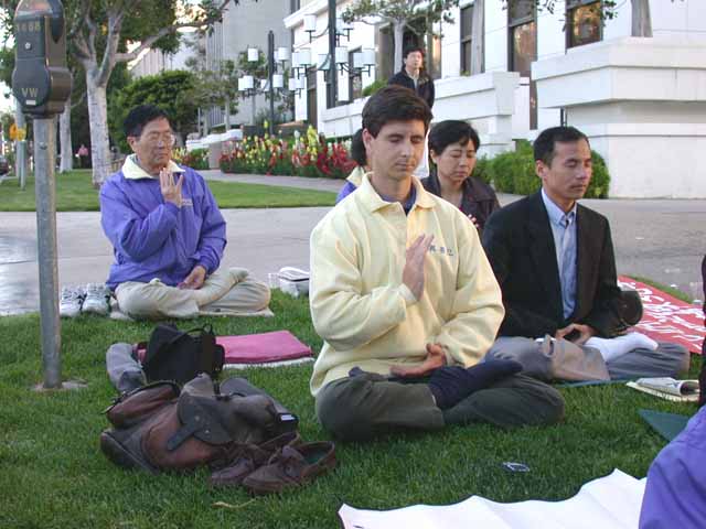 消息说法轮功在星期四晚些时候,继续在中心商业区举行大型炼功活动,呼吁中国主席江XX停止对大陆修炼者的迫害。