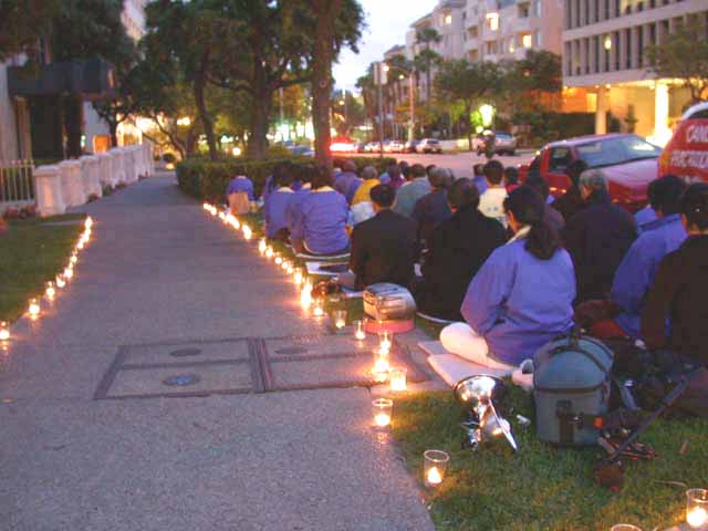 晚上8时,学员在中联办对面公园。三发正念(20时正、21时正、22时正)同时学法、交流心得,这次活动22时20分结束。
