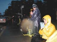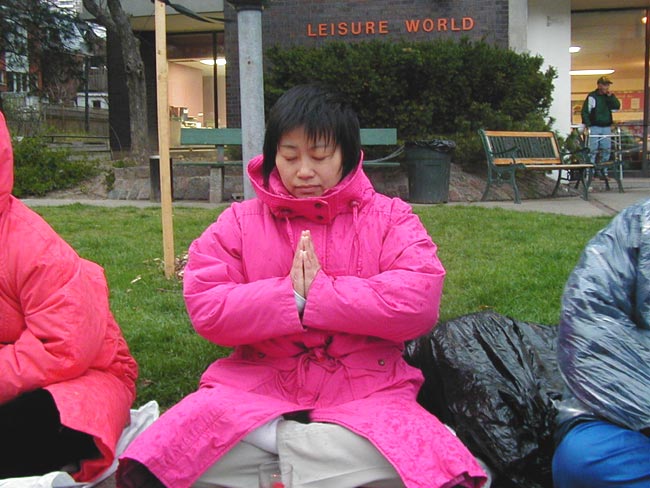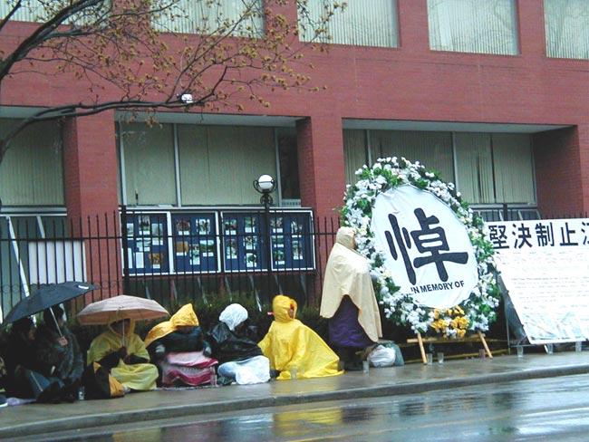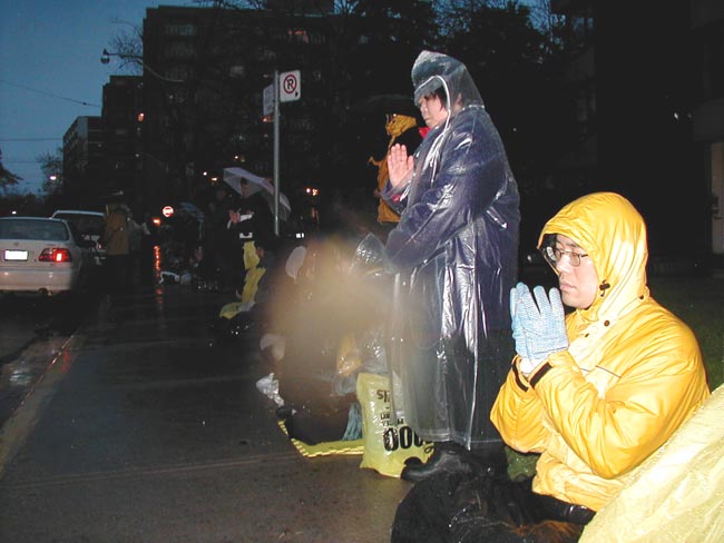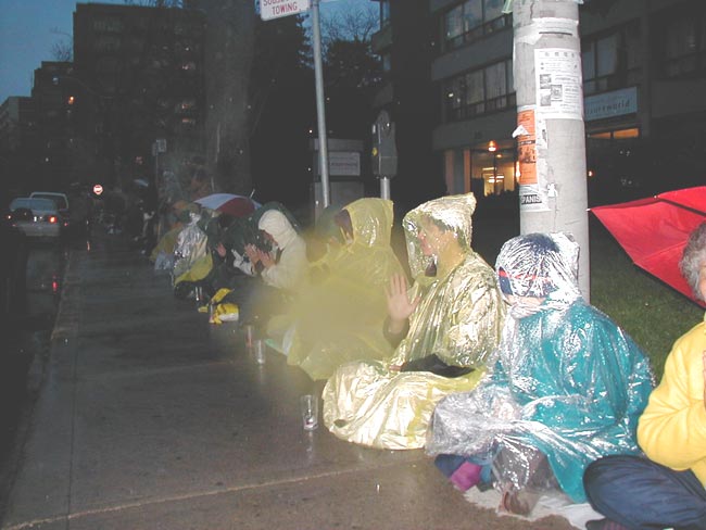 当多伦多大法弟子在中领馆前开始发正念时,突然天空下起雨来,而且雨一直持续了两小时。一些弟子穿着单薄的衣服在雨水中全身都湿透了,一百多名多伦多大法弟子静静地坐在雨水中半小时发一次正念,他们中有老人孩子中年,过往的许多车辆为雨中岿然不动的大法弟子鸣笛,表示着善良人内心的敬佩!