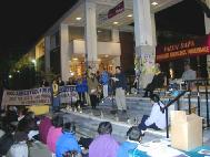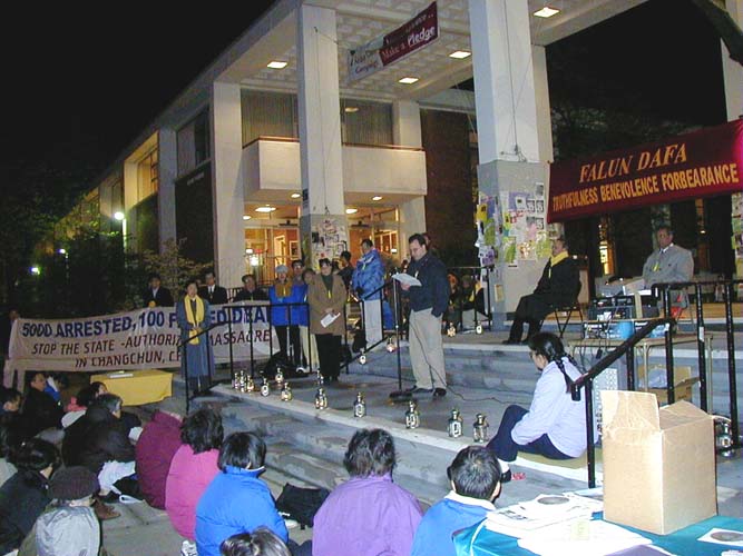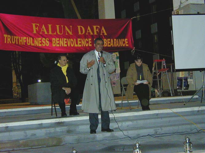 首先,法轮功之友执行主席爱德乐先生致词,回顾了99年4.25以来法轮功在中国所遭受的残酷迫害和法轮功学员的和平抗争的历程,正告江泽民集团,美国人民正在为那些没有自由权益的人行使自己的自由权利,江泽民集团的谎言战争已经失败,迫害必须停止;呼吁所有与会者向自己的家长,老师,国会议员,总统及其他官员分享今晚所了解的事实:对法轮功的迫害是建立在谎言和歪曲的基础之上的。