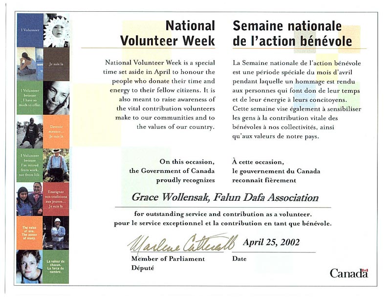 获奖的渥太华法轮功学员戴工羽(Grace Wollensak)女士一直不知疲倦地在社区义务教功、举办法轮功讲座,把“真、善、忍”的美好价值带给加拿大社会;同时,为营救中国受迫害的法轮功学员废寝忘食、做出了巨大的努力。