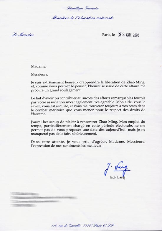 我极其高兴地得知赵明的获释,你们可以想得出,这一事件的幸运结局使我松了一大口气。