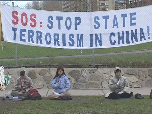 纷纷赶到的学员,静静地伴着音乐炼功,并每半个小时发正念一次,铲除破坏大法的邪恶。