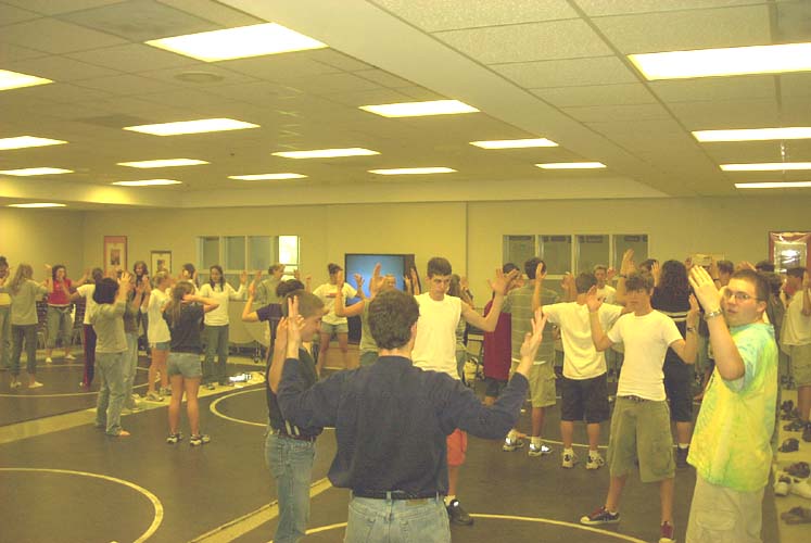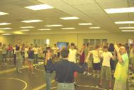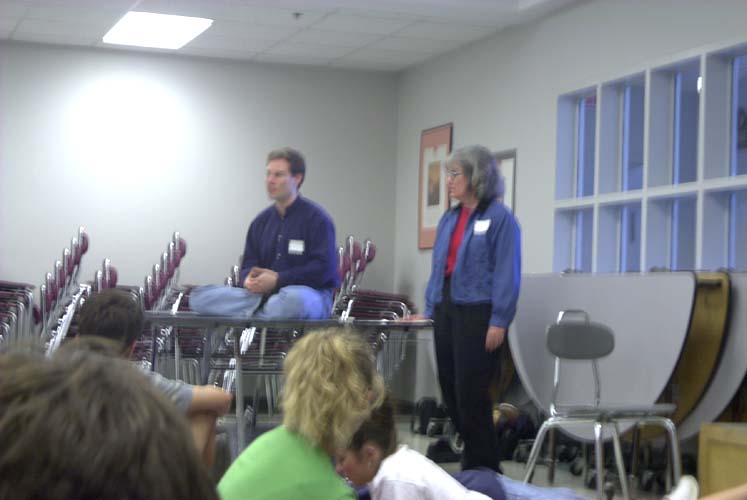 喧哗的教室,在庄严的“普度、济世” 的音乐声中,瞬间变得宁静了,学生们静静地读着法轮大法简介,在接下来的两个小时里,一位学员首先简要介绍了大法的“真、善、忍”法理以及大法的洪传并与师生们一起观看了八分钟的法轮大法介绍影片,接着,学员大卫.斯乃普介绍了他去北京和平请愿的经过。然后,学员们开始教功。