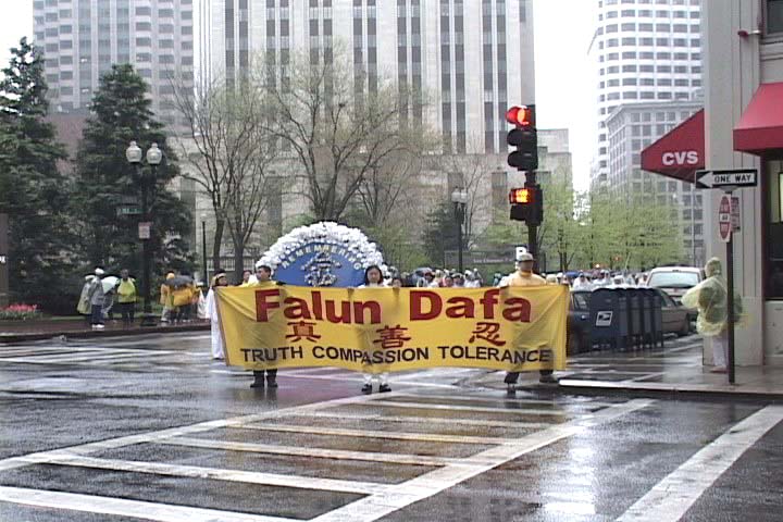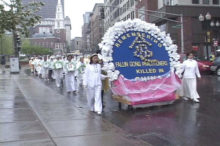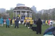 早上9点,学员们来到位于市中心的波士顿公园炼功,发正念,尤为感人的是许多外地学员并没有准备雨具,但风雨阻挡不住他们对众生的慈悲。