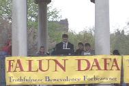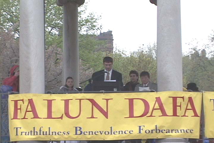 11点钟,新闻发布会正式开始,一位加拿大学员简述了他在中国因为为法轮功上访而被关押迫害18个月的经历,证实了真理是不可战胜的;作为起诉中国江泽民政府的原告,一位美国学员以事实揭露江泽民政府把国家恐怖主义扩展到海外,在美国进行的一系列违法恐怖活动,骚扰,要挟,甚至殴打法轮功学员。发布会上,法轮功学员宣读了麻省众议员Stephen Lynch对法轮功的支持信。