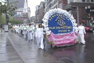 新闻发布会后,在“普度”音乐声中,由警车开道,游行从POST OFFICE广场开始,长长的队伍穿过市中心,几乎是围着中国城转一圈。风雨湿透了学员的衣裳,特别是走在前列身着白衣手捧花圈的女学员,没有任何遮盖,更显庄严,令人肃然起敬。沿路有不少人特地从商店里出来拿材料,问究竟,有人就地在雨中读起真相材料来。一位路人还向游行队伍双手合十。碰到的一些中国人基本都收下了真相材料。警察也非常配合,帮助疏通人群,车辆。