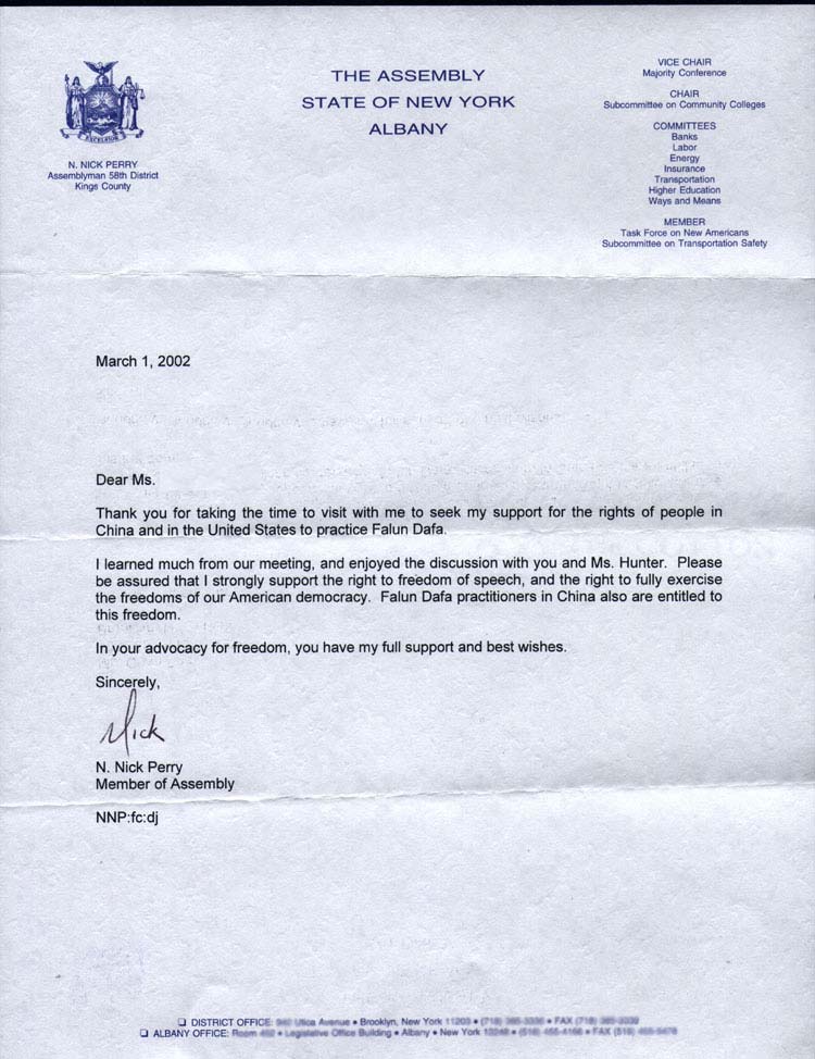 我们的面谈使我得益非浅,我很喜欢与您和亨特女士交谈。请相信,我坚决支持言论自由的权利,以及充份行使美国民主赋予的自由的权利。中国的法轮大法修炼者应该享有同样的自由。