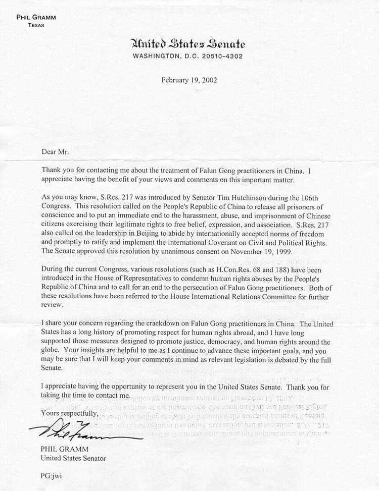 我和你一样对法轮功在中国遭受迫害深表关注。美国在推动外国尊重人权方面有很长的历史。我本人也一直支持那些在全球范围内推行正义、民主、人权的措施。你的见解将有助于我继续推进这些重要目标。请相信,在全参议院就相关的立法进行辩论时,我会记住你的话。